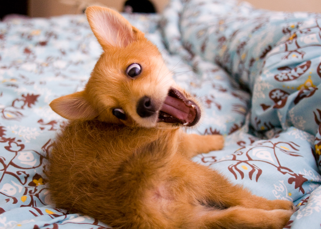 You are in the window surrounded by other puppies. A tottering orange ball of fuzz with little triangular ears, like a fox who lost its tail. Ink-black eyes and round button nose. My wife, pregnant and hormonal, is instantly in love with you. We go inside to play with the puppies, because why would you not want to play with cute puppies while on vacation? You curl up in my cupped hands, calm and sleepy.